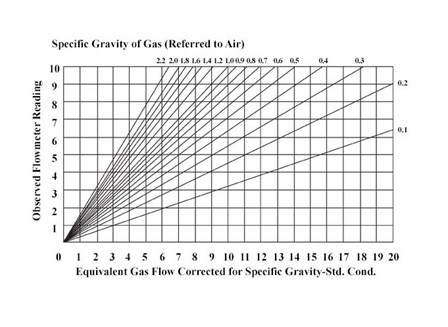 Beaucoup de débitmètres sont étalonnés pour l’air. Si vous les utilisez avec un autre gaz, il faut tenir compte de la différence de densité relative (specific gravity, S.G.).