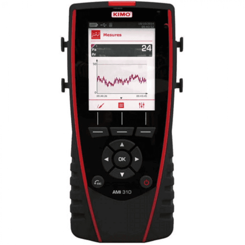 L’appareil de mesure de climat multifonctionnel AMI310 est un peu l’homme-orchestre de la gamme d’appareils de mesure portables de Kimo. Toutes les sondes existantes, comme pour la mesure de température, l’humidité relative, le dioxyde de carbone (CO2), le monoxyde de carbone (CO), la vitesse de l’air, la pression différentielle et bien d’autres encore peuvent y être raccordés. La série AMI310 est disponible en packs composés avec une sélection de sondes, ou à composer entièrement selon les souhaits du client. Cet appareil de mesure portable est livré dans un coffret de rangement solide et, sous forme de packs, avec un certificat d’étalonnage pour l’appareil et des sondes fournies.