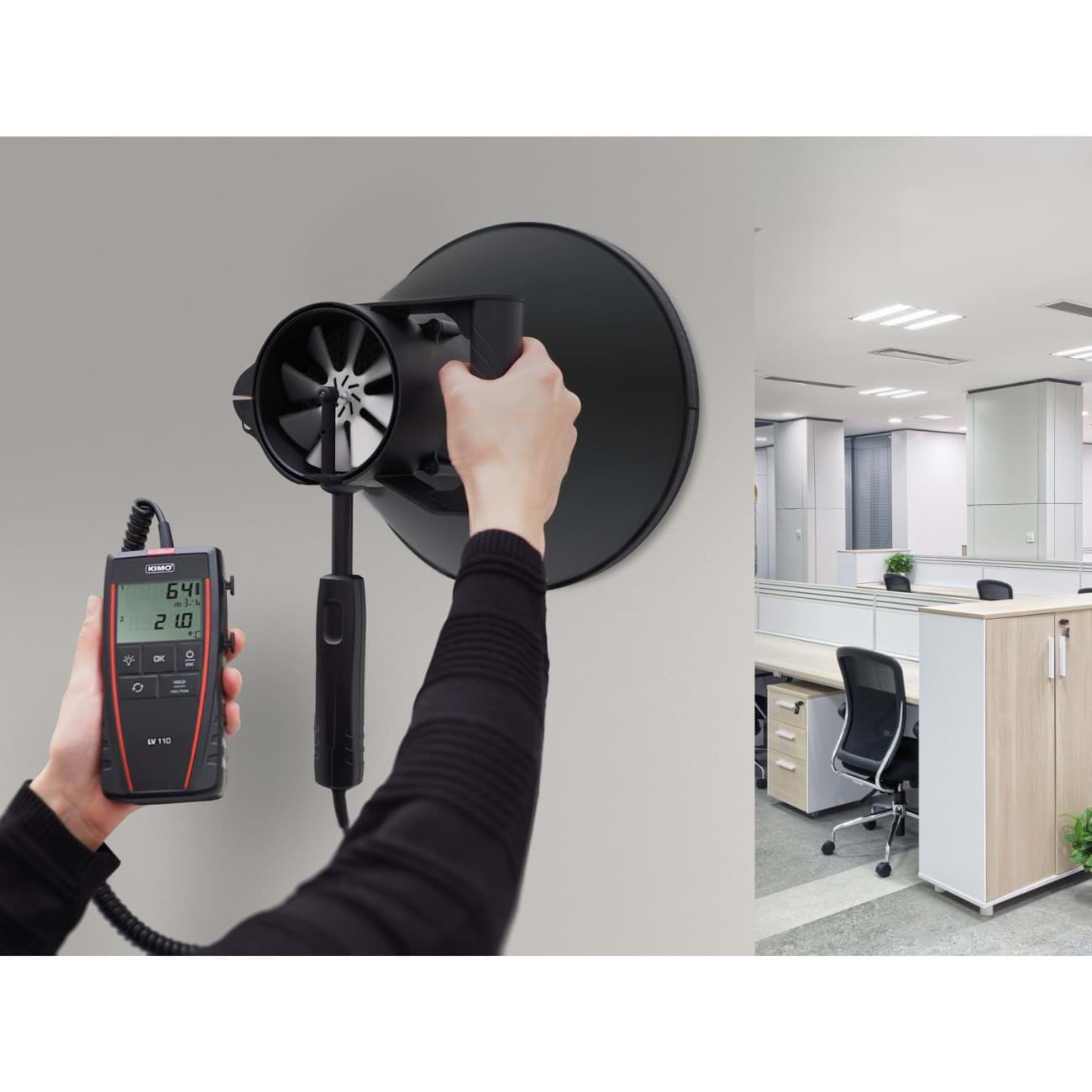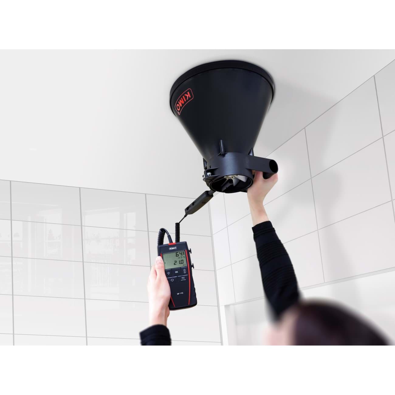 Le Kimo Si-K25 est un cône de mesure de flux d'air de haute qualité, spécialement conçu pour des mesures précises en combinaison avec des anémomètres à hélice d'un diamètre de 100 mm. Ce cône est équipé d'un redresseur de flux d'air innovant avec une structure en nid d'abeilles, qui réduit considérablement les turbulences et garantit un flux d'air laminaire et stable. Cela se traduit par des mesures fiables et précises de la vitesse et du volume d'air.