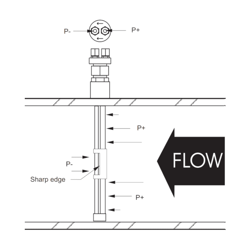 Le capteur MFS-SS effectue une moyenne le long de la hauteur ou du diamètre de la conduite. Il mesure la pression totale (P+) qui se compose de la pression dynamique et statique ainsi que d'une pression plus basse amplifiée (P-). Celle-ci forment une pression différentielle proportionnelle au débit.